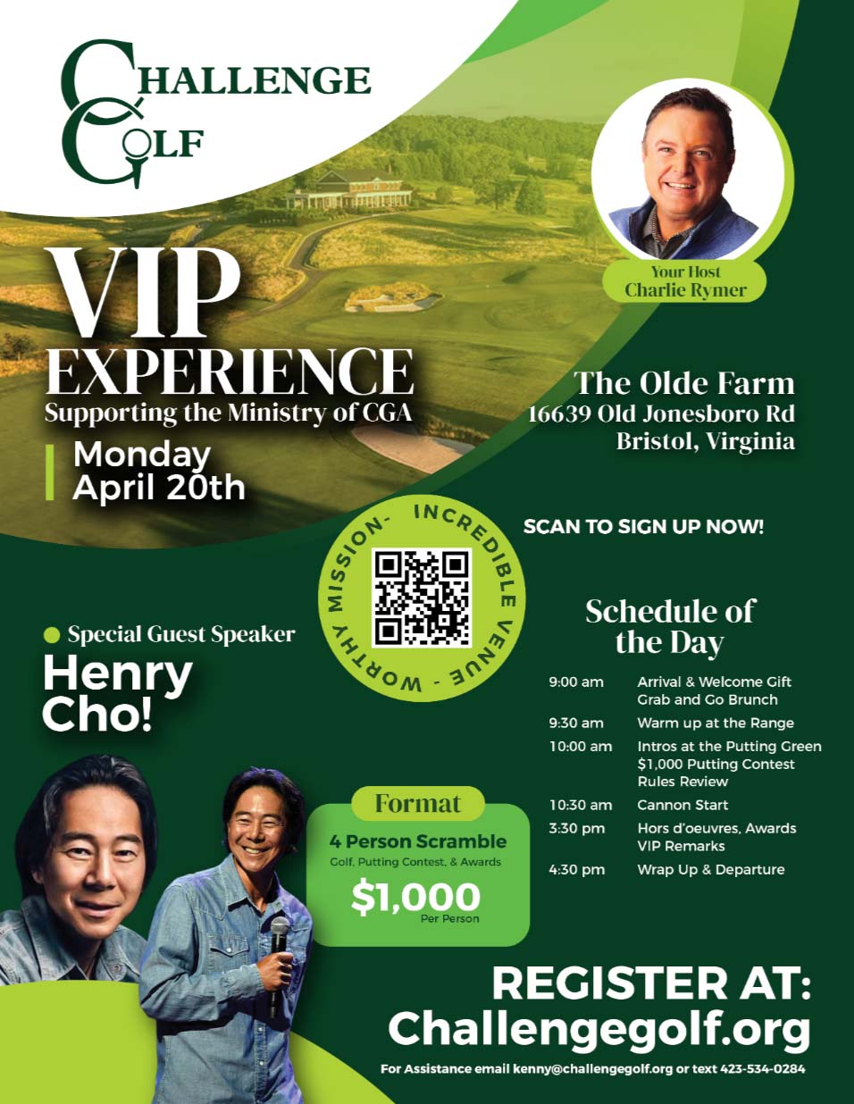 Support the Ministry of CGA and experience a one-of-a-kind VIP experience at The Olde Farm. Hosted by Charlie Rymer with special guest speaker Henry Cho, teams battle it out in a four-person scramble format with special contests throughout the day.